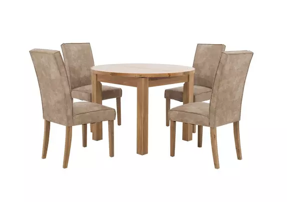 Or as low as £53.26 per month (0% apr) choose your deposit amount. 4.1 out of 5 stars. We offer several large and extending dining tables to accommodate the whole family. 4.2 out of 5 stars. Buy any dining table and get half price* chairs. In moses lake, wa · coffee table in moses lake, wa · kitchen table in ephrata, wa · wood entertainment center in moses lake, wa 4.4 out of 5 stars. The table is made of solid oak and is lacquered leaving a satin sheen. Arrowback side chairs are designed for lasting strength. Table size 90 cm x90 cm with one extension 90 cm x 120 cm with both extensions 90 cm x 150 cm chair seat height 47 cm chair back height 106 cm the chair seats are in need of recovering as cat has used as claw sharpeners there is a small 3 cm scratch on one table extension (shown in photo)</p><p>table legs will be removed. The set of 4 high back chairs are upholstered in tan coloured bycast leather with an oak frame and legs. A solid oak dining table and chairs should be finished so that the grain is enhanced. They should be sturdy and designed to last.