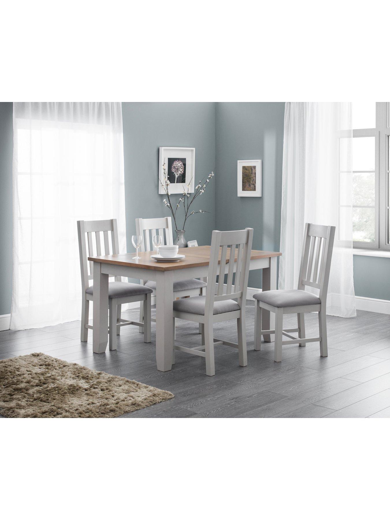 Oxford 70cm solid oak extending dining table with duke fabric chairs.